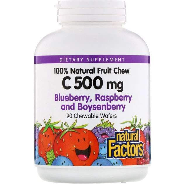 Вітамін C, зі смаком лохини, малини та бойзенової ягоди, Vitamin C, Natural Factors, 500 мг, 90 таблеток (NFS-01326)