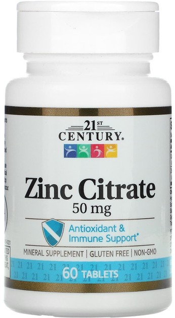 Цинку цитрат 50 мг, 60 таблеток, антиоксидантна дія та підтримка імунітету, 21st Century.