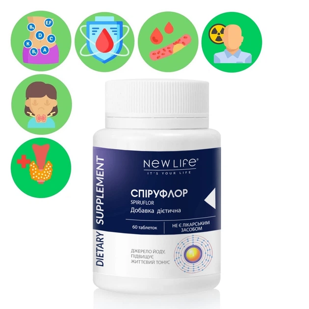 Спіруфлор / Spiruflor Добавка Дієтична Вітаміни, Джерело Йоду Нове Життя (New Life) 60 Таблеток