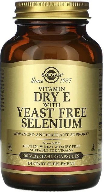 Вітамін Е сухий Solgar Vitamin E із селеном без дріжджів, 100 вегетаріанських капсул (SOL-03351)