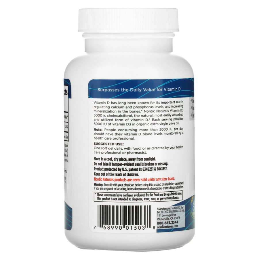 Nordic Naturals Vitamin D3 5000 IU - це харчова добавка, яка містить 5000 МО вітаміну D3. Вітамін D3 відіграє важливу роль у здоров'ї кісток, зубів, м'язів та імунної системи. Вітамін D давно відомий своєю важливою роллю в регулюванні рівня кальцію та фосфору та підвищенні кількості мінералів у кістках. Даний вітамін D3 є холекальциферол, натуральну, найлегше засвоювану і корисну форму вітаміну D.
