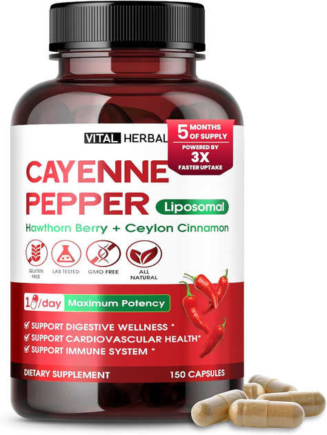 Добавка преміум-класу Vital Herbal Liposomal Cayenne Pepper with Hawthorn Berry & Ceylon Cinnamon 150 капсул