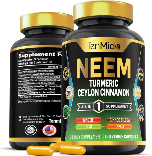Добавка преміум-класу з листя німу для підтримки імунітету Tenmido Neem with Turmeric 150 капсул