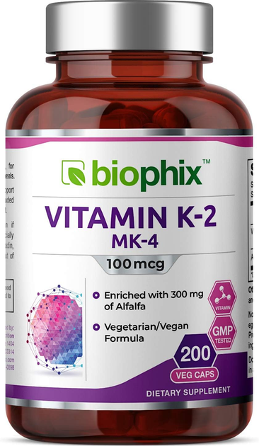 Добавка преміум-класу сприяє здоров'ю кісток та артерій Biophix Vitamin K2 MK-4 100 mcg 200 капсул