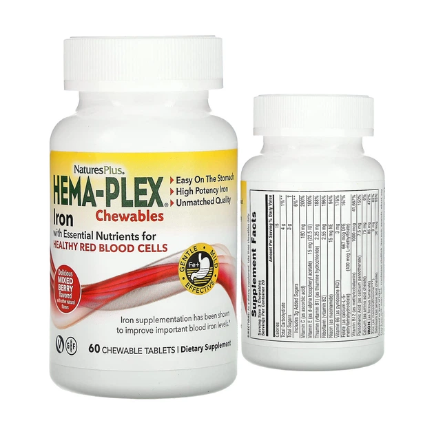 NaturesPlus Hema-Plex жувальні таблетки із залізом суміш ягід 60 жувальних таблеток феритин гемоглобін підвищення харчова до