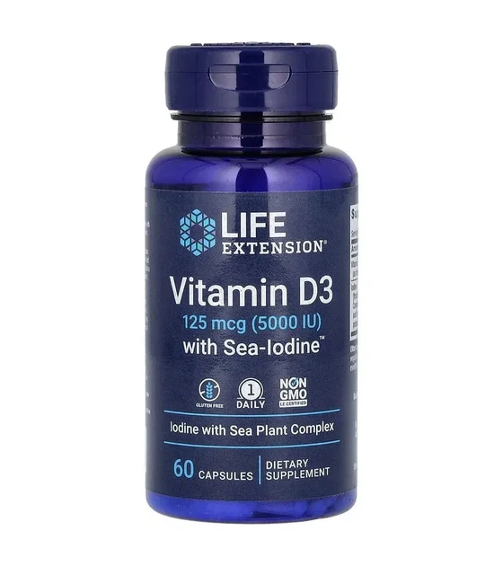 Вітамін Д3 з морським йодом, Vitamin D3 with Sea-Iodine, Life Extension, 5000 МО, 60 капсул