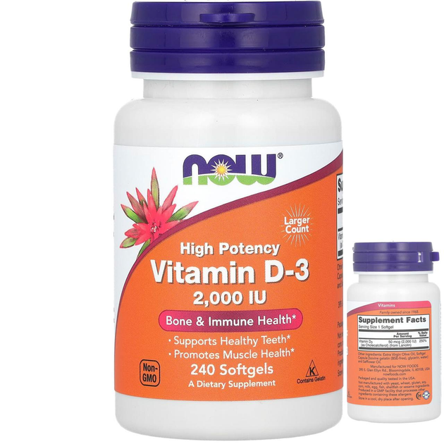 NOW Foods вітамін D3 високоактивний 2000 МО 240 м'яких таблеток Д3 для кісток імунітету добавки імуномодулят