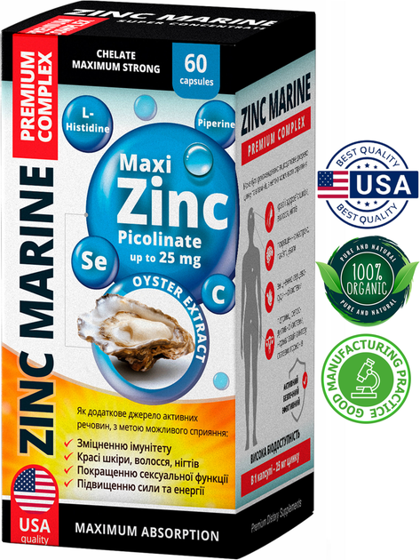 Природна добавка Цинк морський преміум комплекс №60 для зміцнення імунітету, краси шкіри, волосся, нігтів, покращення сексуа