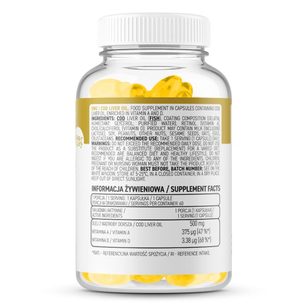 OstroVit Cod Liver Oil - це харчова добавка в капсулах, що містить жир печінки атлантичної тріски, збагачений вітамінами A і D. Це одне з джерел, що швидко резорбуються незамінних жирних кислот омега-3 (в основному EPA і DHA), що підтримує правильне функціонування організму. Препарат створений для спортсменів і для людей, чий раціон особливо бідний на ненасичені жирні кислоти омега-3.