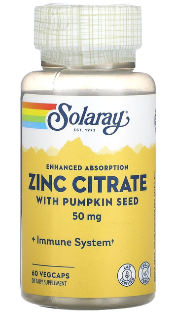 Цинк цитрат з гарбузовим насінням, 50 мг, 60 рослинних капсул Solaray,