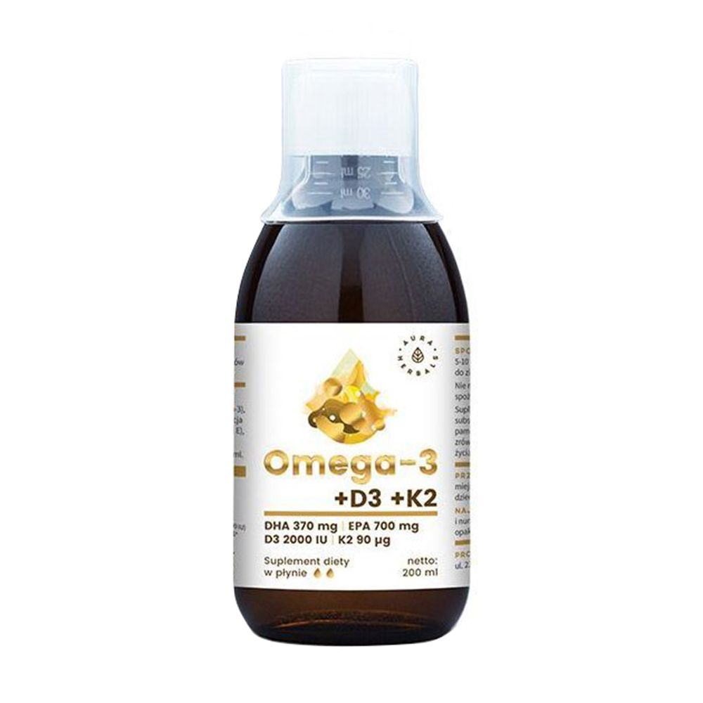 Омега-3 з вітамінами D3 + K2 Aura Herbals Omega + D3 + K2, DHA 370 мг + EPA 700 мг + 2000 МО + 90 мкг, 200 мл