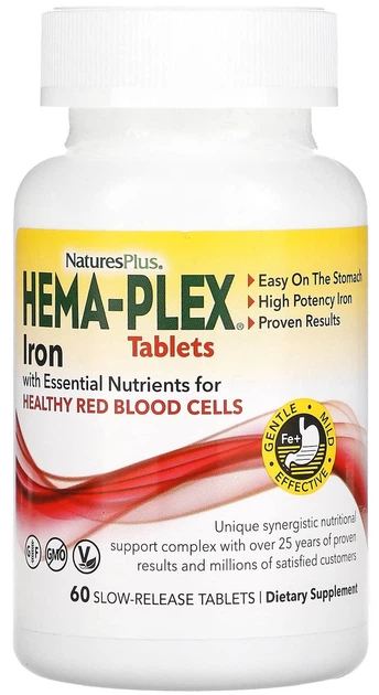 Залізо Hema-Plex 60 таблеток, із повільним вивільненням, легкий для шлунку, NaturesPlus.