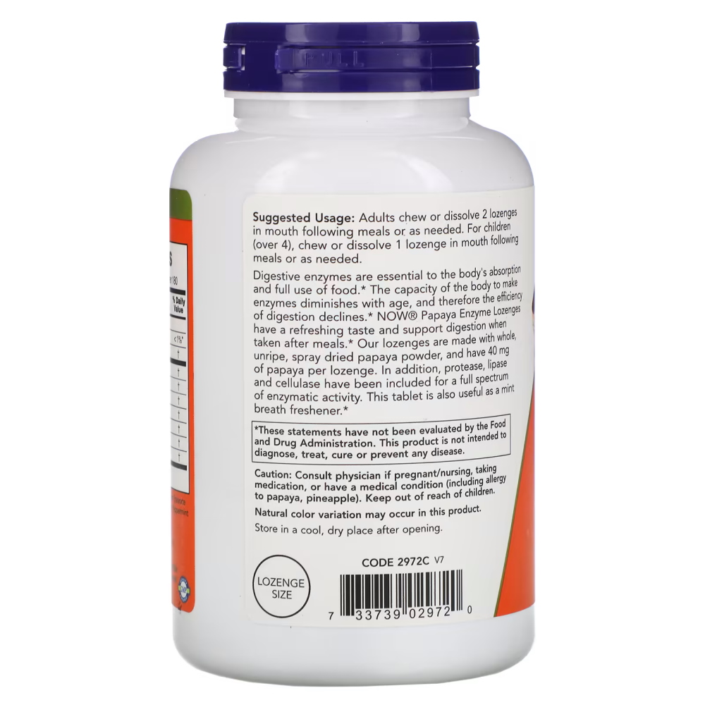 NOW Papaya Enzyme має освіжаючий смак і підтримує травлення після їжі. З віком здатність організму виробляти ферменти знижується, через що ефективність травлення падає. Таблетки містять порошок папайї та додані ферменти протеаза, ліпаза та целюлаза для повного спектра ферментативної активності. Ця добавка також корисна як освіжувач дихання. Як приймати: - Дорослим: по 2 таблетки