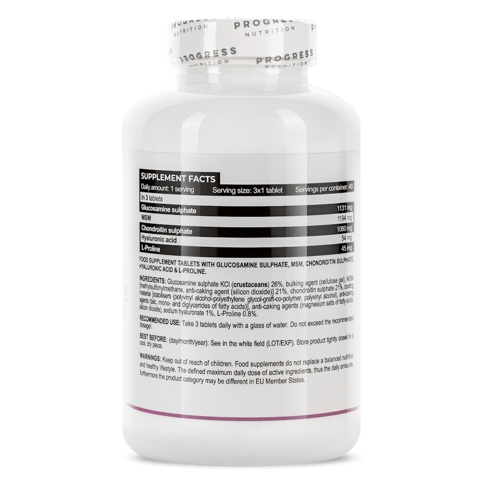 Progress Nutrition Glucosamine Chondroitin MSM Complex – потужний комплексний хондропротектор від європейського бренду спортивного харчування. Прийом добавки оздоровлює як суглоби, а й всю сполучну тканину. Рекомендується приймати всім фізично активним людям, а також особам, які страждають на захворювання суглобів. Призначення Progress Nutrition Glucosamine Chondroitin MSM Complex: - оздоровлення суглобів та