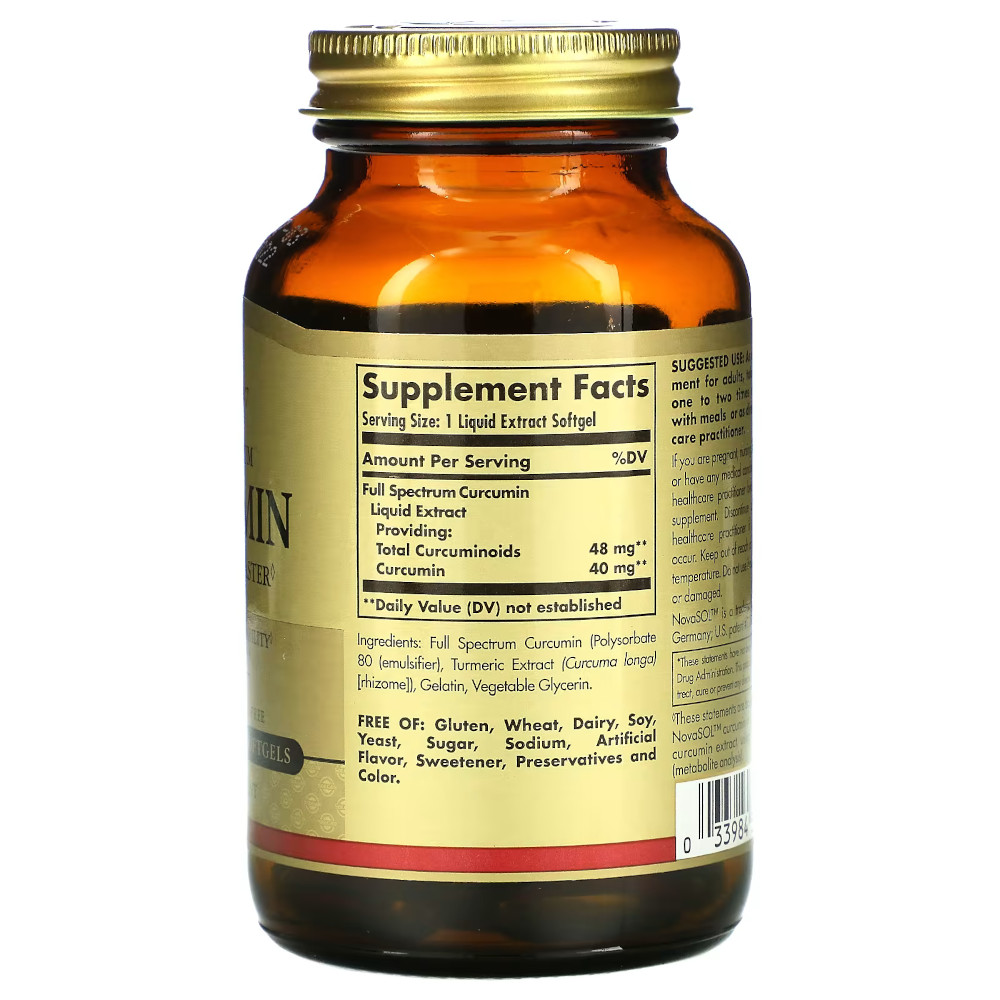 Solgar Full Spectrum Curcumin природний барвник, який має лікувальні властивості. Куркумін Full Sprectrum - це у 185 разів більш доступна форма, ніж звичайний куркумін. Вона перетворює куркумін, що слабо засвоюється, з жиророзчинного на водорозчинний, роблячи його більш засвоюваним і активним. Особливості: - Сприяє покращенню травлення - Нормалізує мікрофлору кишечника - Зв'язує вільні