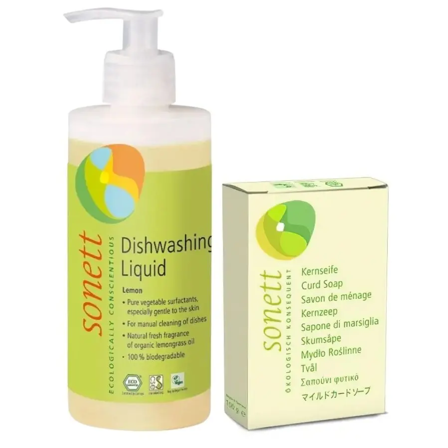 Набір Sonett: Органічне тверде мило Sonett 100 г + Органічний засіб для миття посуду Sonett Лимон концентрат 300 мл