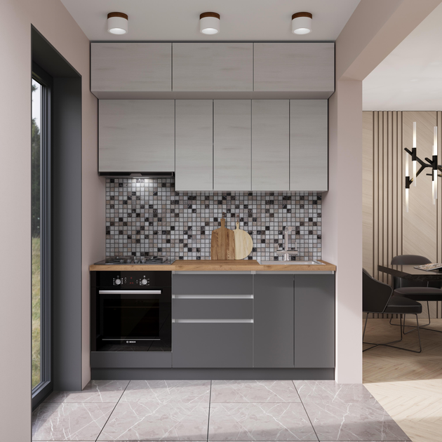 Кухня ДСП 1 Класік SENAM 1,8 м вбудовані плита та витяжка, з антресолями, без ручок Ясен серфсайд чистий / Графіт сірий (ДСП