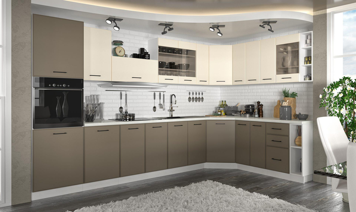 Кухонний кутовий набір Модерн Еверест 5.55 м, зі стільницею, без мийки, Мокко глянець, Латте глянець, Білий глянець, Білий