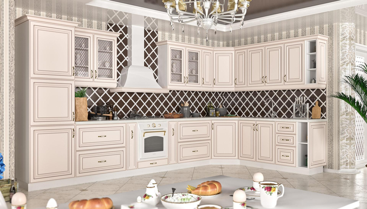 Модульна кухня ІМПЕРІЯ класика кутова (7 верхніх + верхній кут + 8 нижніх тумб + нижній кут + шафа-пенал) 410 / 210 - 230 см