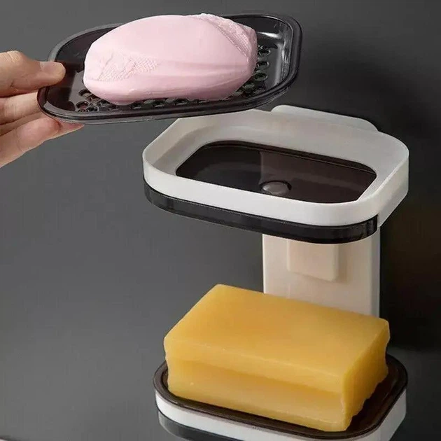 Настінна мильниця на липучці у ванну зі зливом подвійна Soap dish, пластикова підставка для мила, дворівнева, для мила, губк