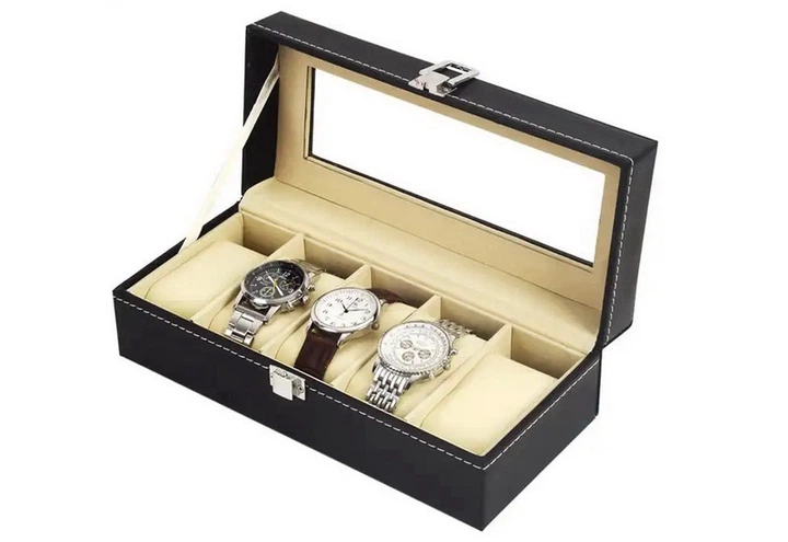 Скринька для зберігання годинника WS6-09 на 6 відділень чорна коробка зі штучної шкіри з білим рядком футляр органайзер кейс