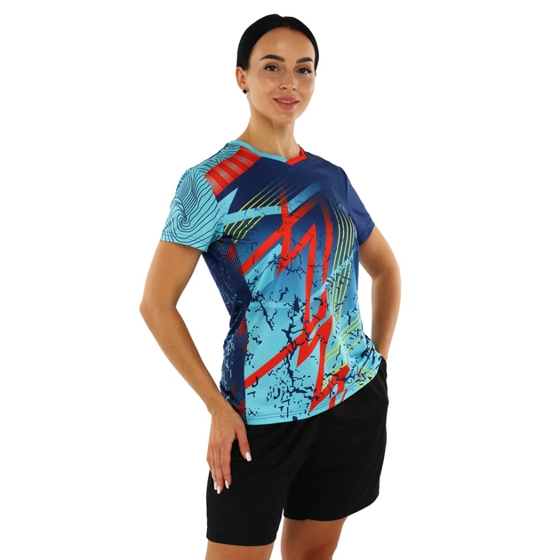 Форма волейбольна жіноча футболка та шорти LIDONG 7330-8808 (поліестер, р-р S-2XL(44-48), колір блакитний-синій-червоний)