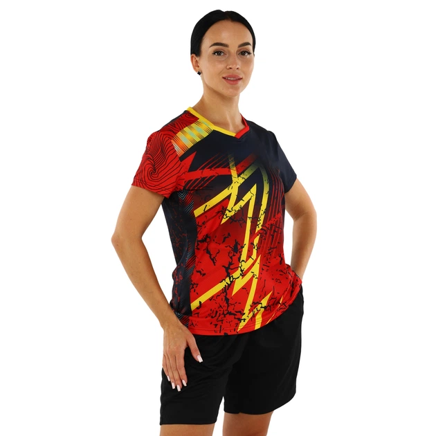 Форма волейбольна жіноча футболка та шорти LIDONG 7330-8808 (поліестер, р-р S-2XL(44-48), колір червоний-жовтий-темно-синій)