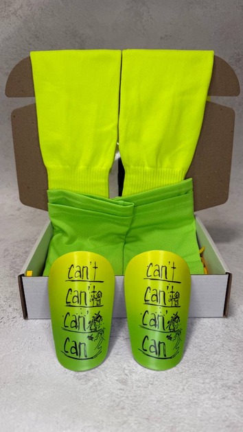 Подарунок футболісту "Футбольний бокс міні" салатовий: міні-щитки, тримачі для щитків, гетри-обрізки