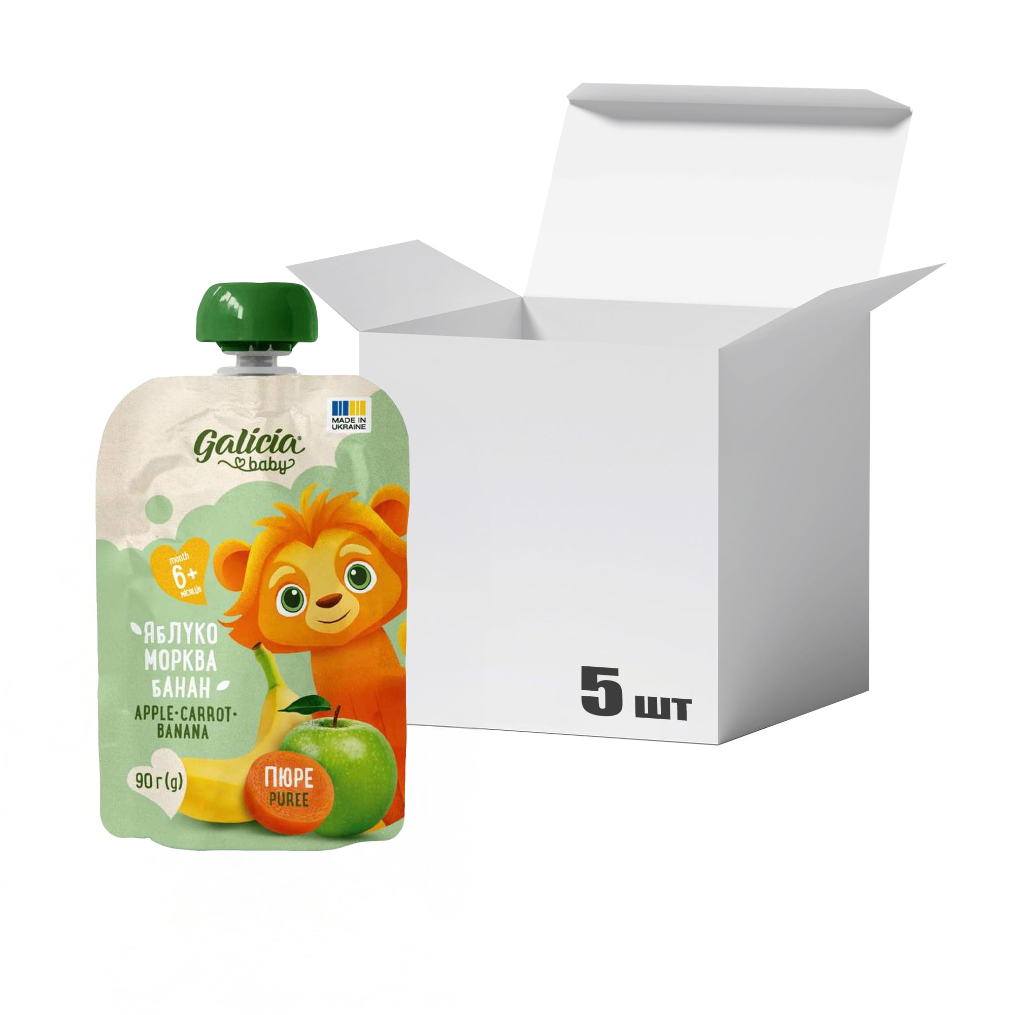 Упаковка дитячого пюре Galicia Baby Яблуко-морква-банан, від 6 місяців, 90 г * 5 шт