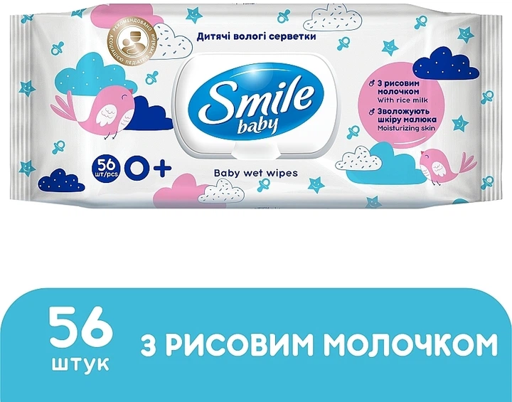 Дитячі гіпоалергенні вологі серветки з рисовим молочком, 56 шт. - Smile Ukraine Baby 56шт (950293-27521942)