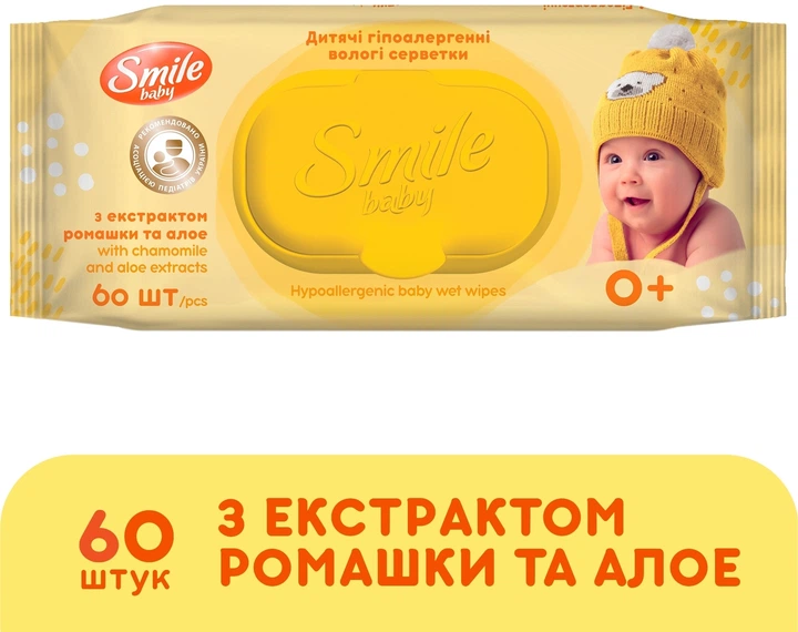 Дитячі вологі серветки "Екстракт ромашки та алое з вітамінним комплексом" з клапаном, 60шт - Smile Ukraine Baby 60шт (263013