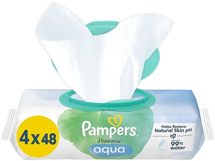Дитячі вологі серветки, 4x48 шт. - Pampers Harmonie Aqua Baby Wipes 4x48шт (1348145-27057011)