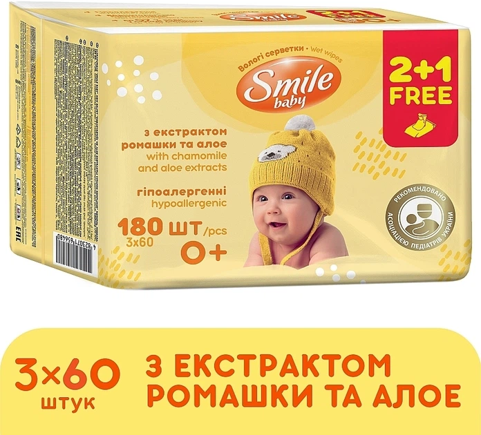 Вологі серветки 2+1 екстракт ромашки та алое - Smile Ukraine Baby 3x60шт (601467-27055775)