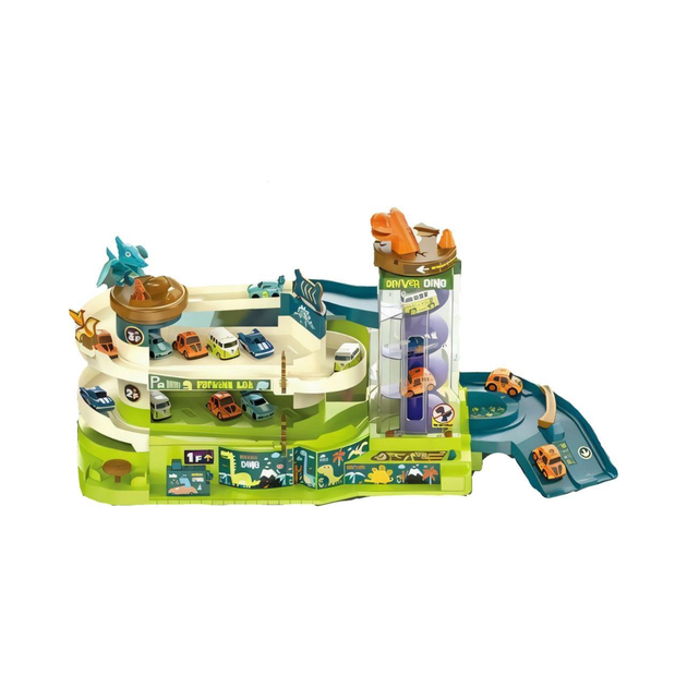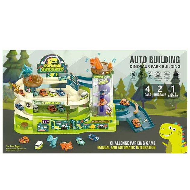 Трек t 103-55 a (6) парковка, підсвічування, звукові ефекти, 3 поверхи, 4 машинки, ліфт, 2 режими роботи, барикади, динозавр
