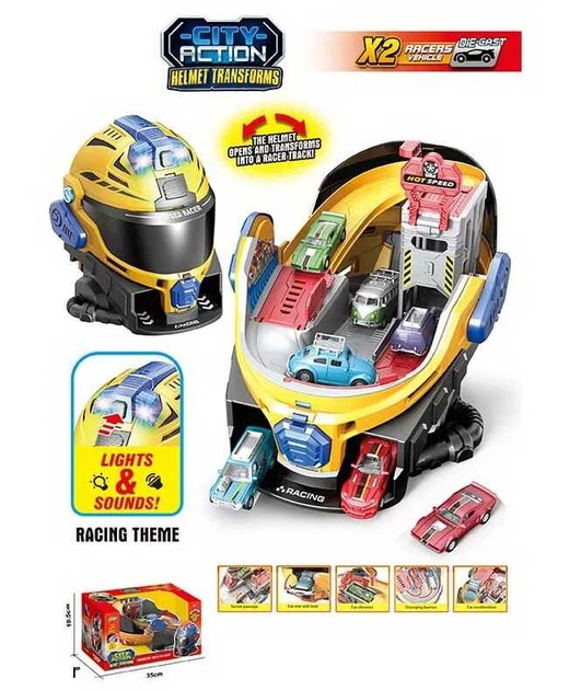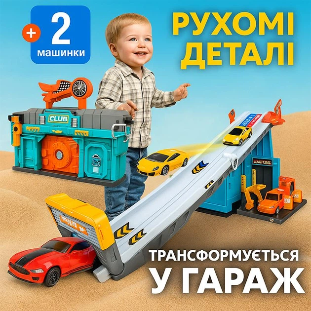 Ігровий гараж трансформер з треком валізою, рухомі деталі, трек, 2 металеві машинки у комплекті