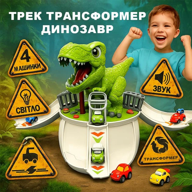 Трек трансформер Динозавр - трамплін з 4 машинками в комплекті, механічний запускач, звуковий, світловий супровід