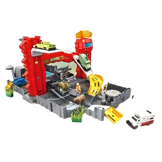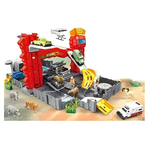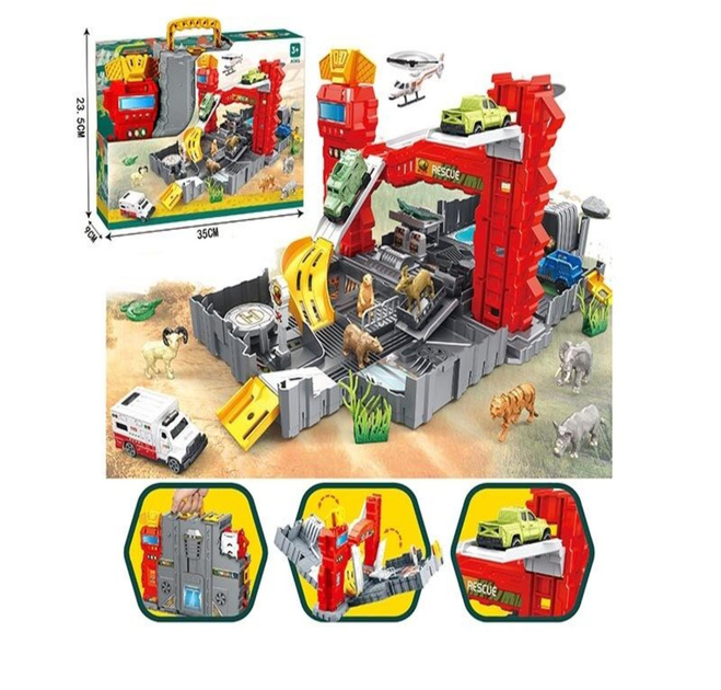 Паркінг SY 9944 з машинками та фігурками тварин складається у валізку з рухомими частинами