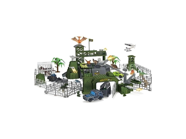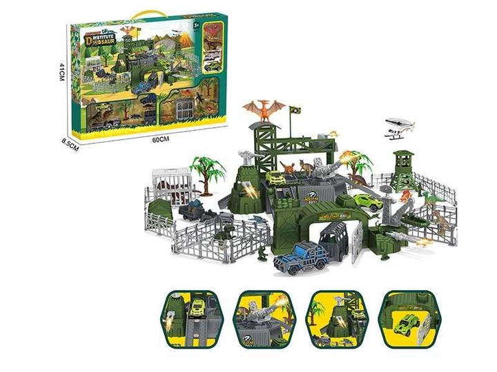 Парковка SY 9938 "Військова база", солдатики, спецтранспорт, гумові динозаври, клітки, наліпки, в коробці.