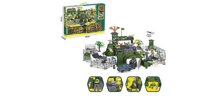 Парковка SY 9938 військова база, солдатики, спецтранспорт, гумові динозаври, клітини, наклейки, в коробці