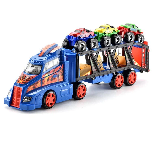 Трейлер HC 38074 автовоз, 5 машинок, металопластик, рампа для трюків, механічний запускач, рухомі деталі, перешкоди, дорожні