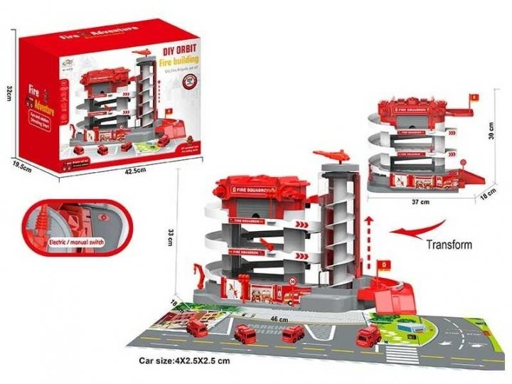 Ігровий набір Парковка 1232-14 "Пожежна", світло, звук, електричний ліфт, 4 поверхи, 4 машинки, в коробці