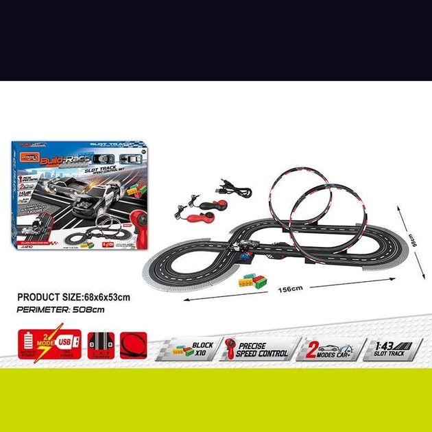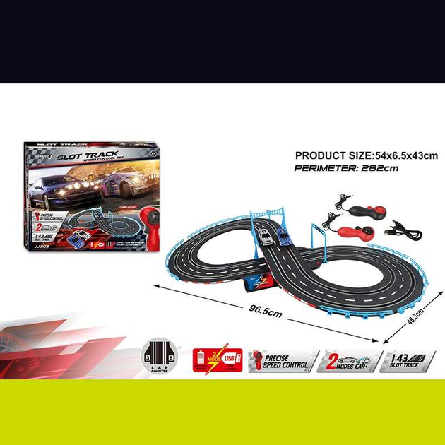 Трек JJ 210-1 (8) 2 машинки, 2 джойстики на батарейках, розмір треку 98х156 см, масштаб 1:43, в коробці