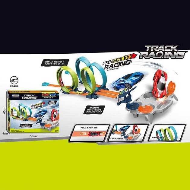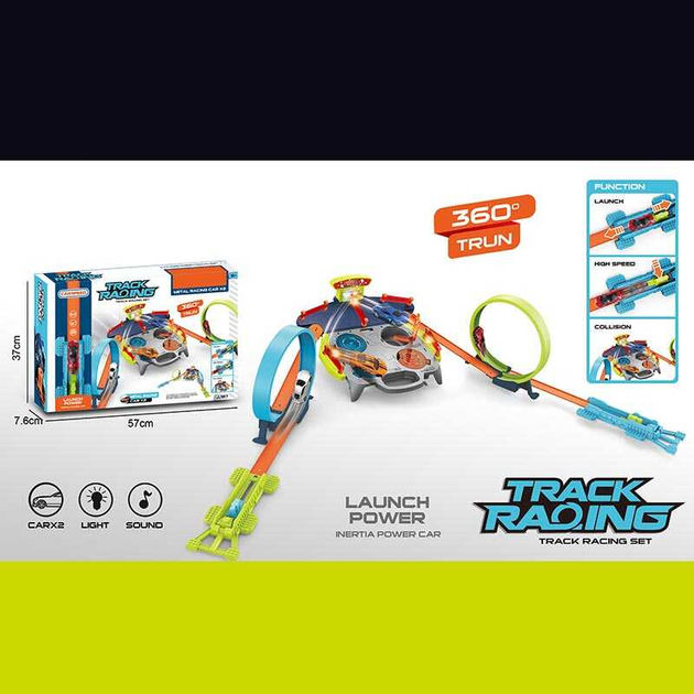 Трек JJ 170 2 машинки інерція 3 перешкоди трюкові петлі в коробці 57 см 7.5 см 37 см