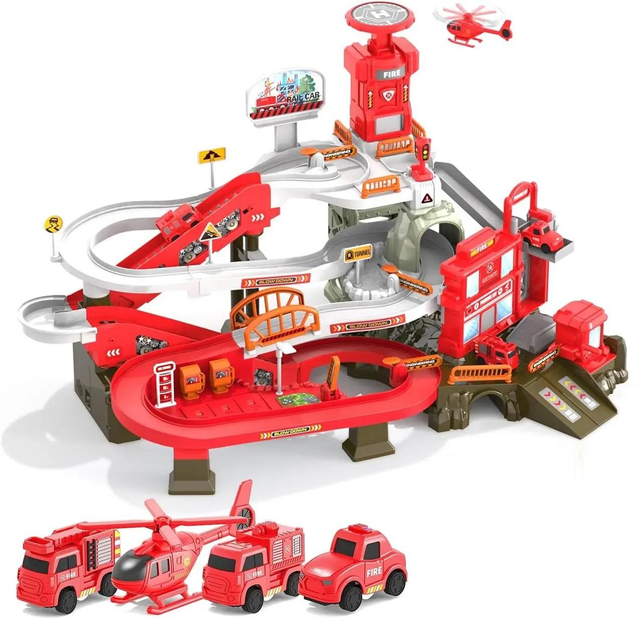 Дитячий ігровий автотрек, що розвиває Пожежна станція з автоматичним підйомником і вертолітним майданчиком з підсвічуванням