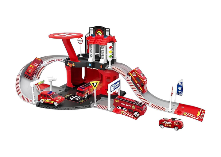Трек 666-07 3 металопластикові машинки, гелікоптер, 3 рівні, муляжі оточення, наліпки, в коробці