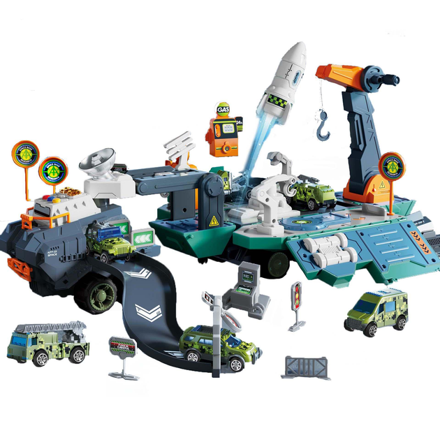 Космічна станція JP 588-15 2в1, світло, звук, інерція, 6 металопластикових машин, катапульта, механічний запуск ракети та пі