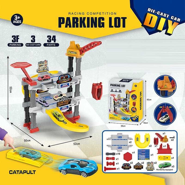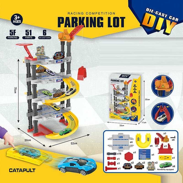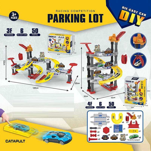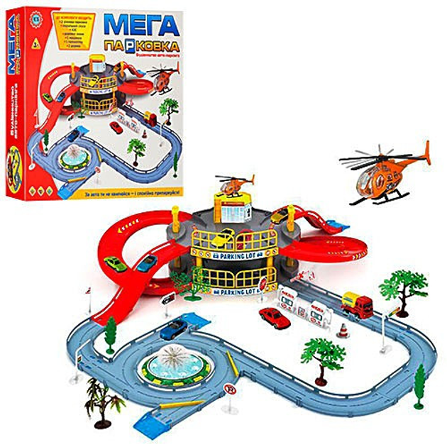 Трек 939-304 парковка, 50 елементів, механічний підйомник, катапульта, 6 металопластикових машин, у коробці