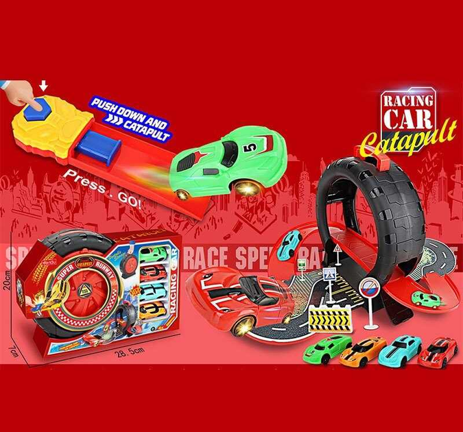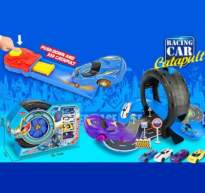 Трек 939-305 парковка, 51 елемент, механічний підйомник, катапульта, 6 металопластикових машин, у коробці