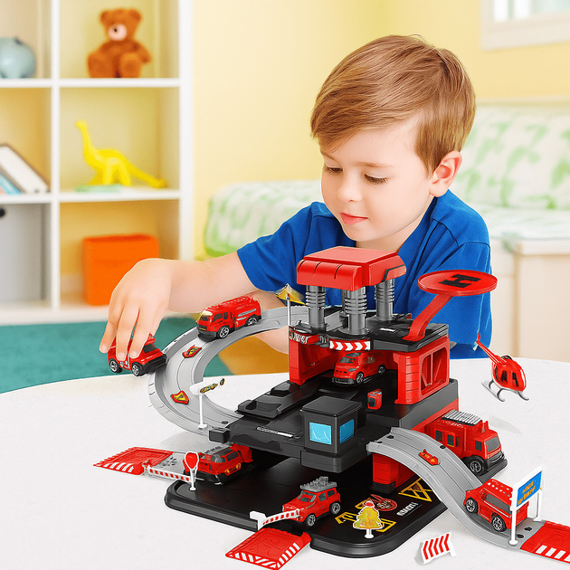 Трек пожежна станція на 3 рівні (666-10) 3 металопластикові машинки, гелікоптер, муляжі оточення, наліпки