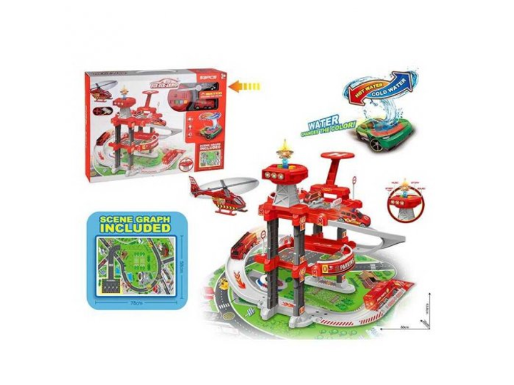 Трек пожежна станція на 3 рівні (666-10) 3 металопластикові машинки, гелікоптер, муляжі оточення, наліпки